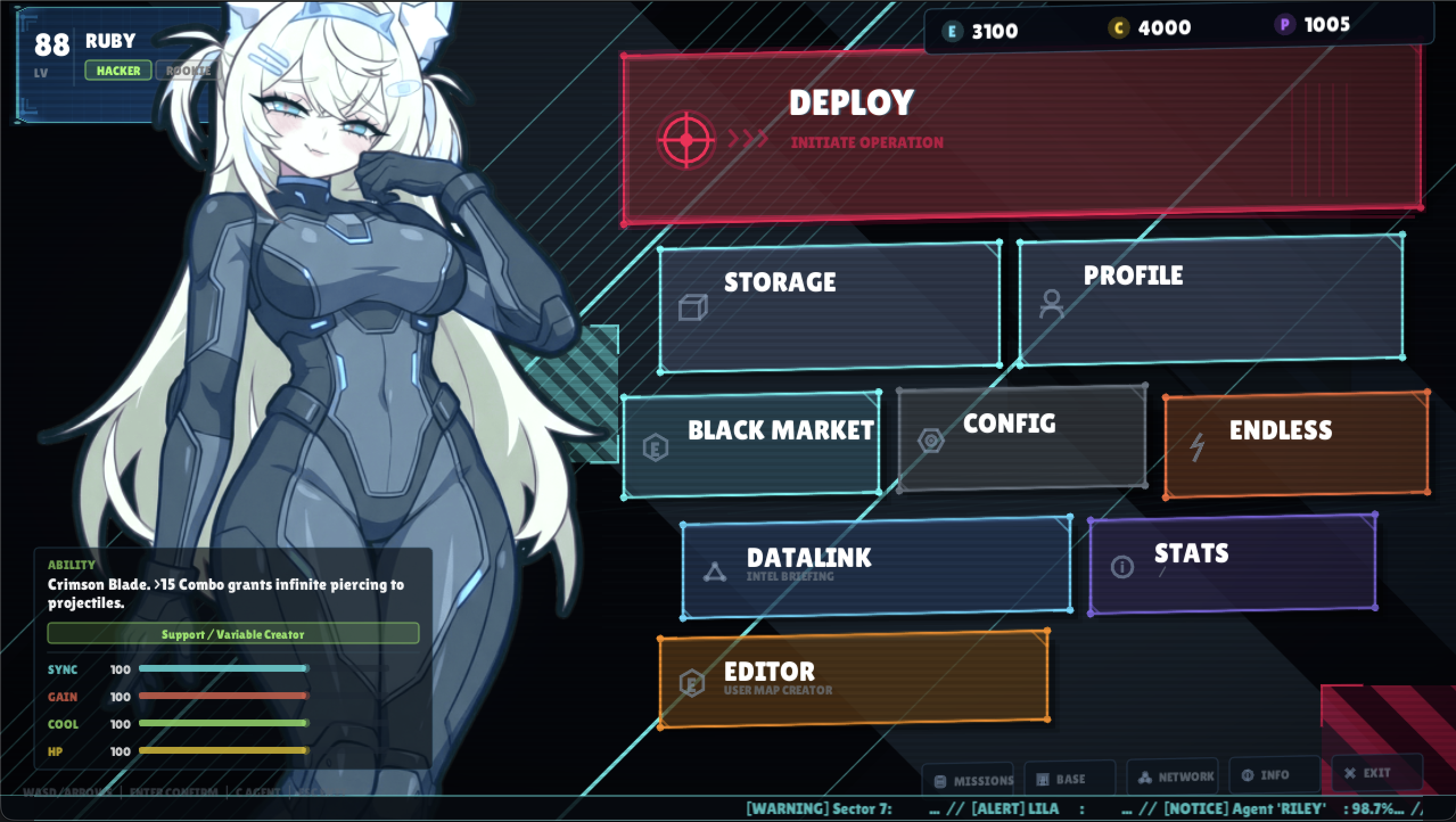From the hub, you can access everything: Deploy to start missions, Storage for your items, the Black Market for trading, Datalink for intel briefings, the Map Editor for user-created content, and Endless mode for when you just want to keep going.